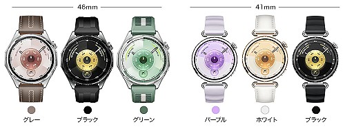 46mmモデルは中性的なデザインで、ブラック・グレー・グリーンといった落ち着いたカラーが揃っています。41mmモデルはエレガントな印象で、パープルやホワイトなど、女性ユーザーを意識したカラー展開となっています。
