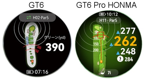 一方で、GT6 ProおよびGT6 Pro HONMAでは、より戦略的なプレーを支援する機能が追加されていて、ゴルフ用途に特化した設計となっています。