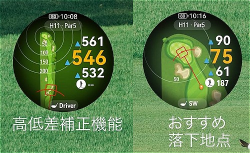 高低差機能は、打ち上げ・打ち下ろしのあるホールでも打つべき目安距離を自動算出してくれますので、ホームコースで起伏が多い方に適しています。