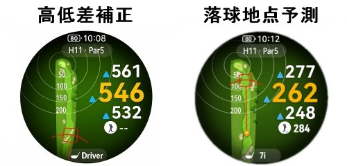 特に最上位のHONMAモデルには、高低差補正、落球地点予測が搭載されていて、AIキャディと呼ぶに相応しいナビゲーション機能が充実しています。