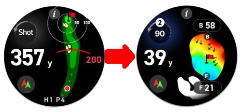 例えば、ティーショット後にグリーンを狙える距離へ近づくと、自動的にアプローチビューへ切り替わります。機器の操作に追われることもありません。
