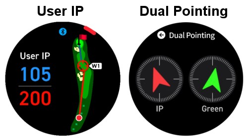 中でも「デュアルポインティング」は、ターゲットが見えない状況でもグリーンとレイアップポイントの両方向を同時に示してくれるため、コース全体の把握が格段にしやすくなっています。