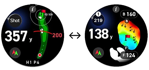 さらに「ロングパットガイド」は、グリーンのアンジュレーションを考慮した打ち出し方向を提案してくれる機能で、まるでキャディにアドバイスを受けているような感覚を得られます。