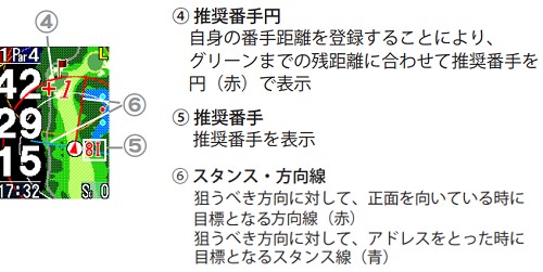 さらに、番手毎の自分の飛距離を登録しておくことで、現在地からの残距離に応じて、推奨番手(⑤)、そして、同距離位置の円(④の赤い線)が表示されます。