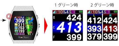 現在地から自分が打ちたい方向のFフェアウェイWの中心までの距離と、その地点からグリーンまでの距離を表示します。